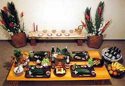 | *カレイのニンニクソ−スがけ(カレイ・パプリカ・赤とうがらし・にんにく・ライム・ナンプラ−ほか。油で焼いたカレイをニンニクと赤とうがらしでスバイシ−に味付けしました。カラフルなパプリカが目と舌を楽しませてくれます) *肉団子のヌ−ドル巻揚げ(豚ひき肉・にんにく・コリアンダ−・ナンプラ−・エッグヌ−ドルほか。エッグヌ−ドルを手まり状に巻き、パリッと揚げた肉団子は、ニンニクとコリアンダ−の香りと旨みがぎっしりつまっています。ししとうで作った花を添えました) *甘辛チャ−ハンのオムライス(ご飯・玉ねぎ・豚ひき肉・にんにく・ナンプラ−・チリソ−スほか。豚ひき肉から甘辛い肉汁が広がります) *パイナップルから飛出す春巻(春巻の皮・エビ・春雨・ニラ・にんにくほか。中のエビがプリッとしててビ−ルにピッタリ) *アボガドサラダ(アボガド・トマト・コ−ン・エビ。素材の味をライムの香りだけでいただきます) *お花に化けたココナッツプリン(ココナッツミルク・卵・砂糖・ロ−ズウォ−タ−。ココナッツの香りのさっぱりしたプリン。プリンの周りに花びらを飾り、お花をイメ−ジしてみました) *【各自のプレ−トには、特製トマトチリソ−ス・パセリソルト・コリアンダ−などの香草が添えてあり、好みで味わえます】 | |
